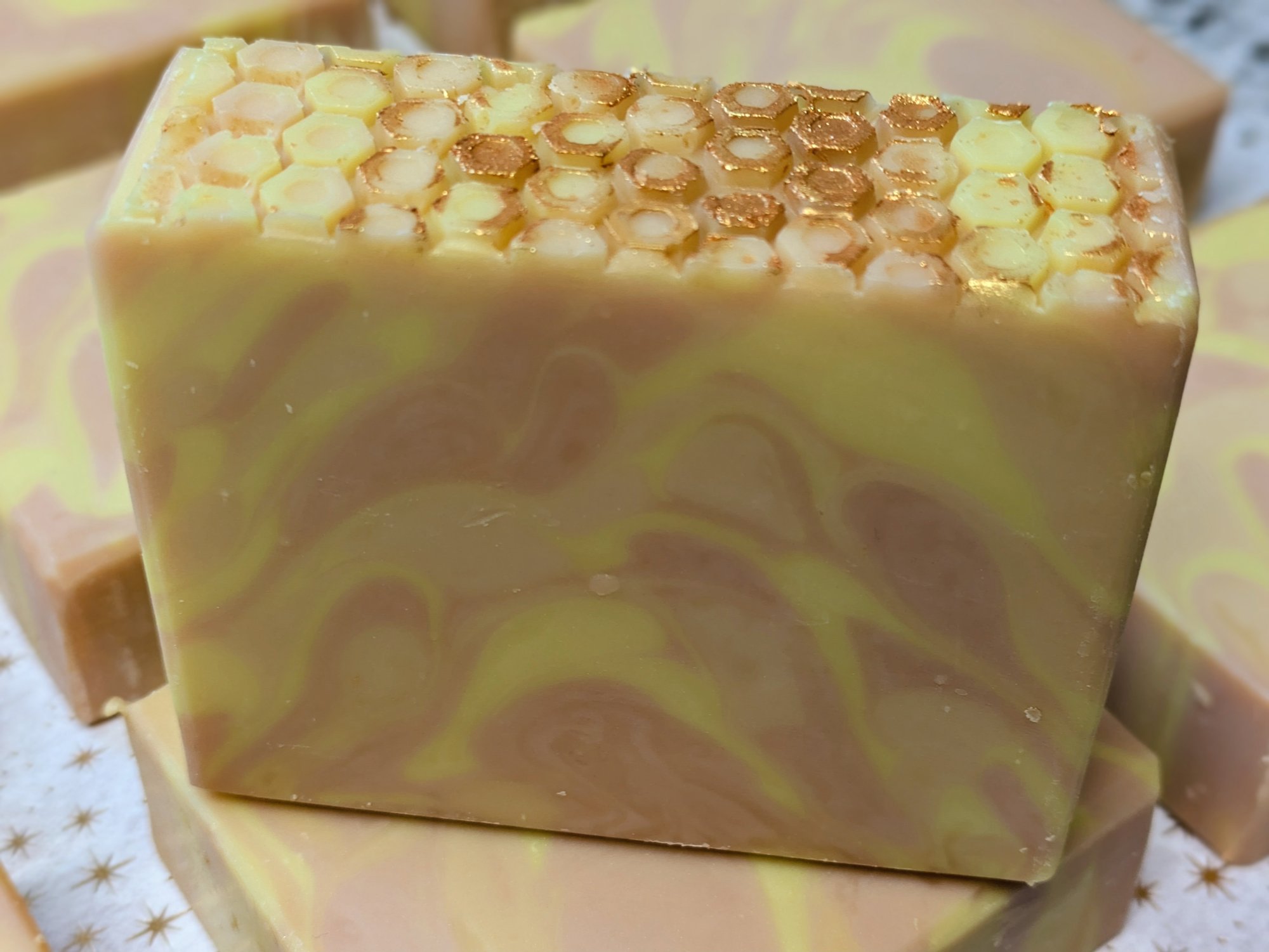 A golden orange and yellow bar of warm honey scented soap, topped with a honeycomb pattern and gold shimmer.